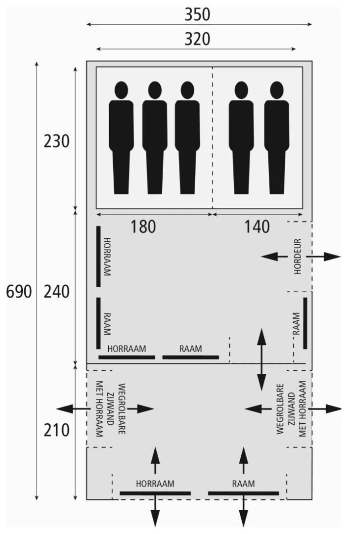 De binnentent is van ademend technisch katoen, met een Oxford polyester kuipgrondzeil, en is verduisterd, voor extra slaapcomfort. De tussenwanden in de slaapcabine zijn wegritsbaar, voor een flexibele indeling. De tent is rijkelijk voorzien van gaas, voor een optimale ventilatie. De voorwand en de tussenwand zijn uitritsbaar, om een optimaal gebruik van de ruimte te kunnen maken,onder alle weersomstandigheden.