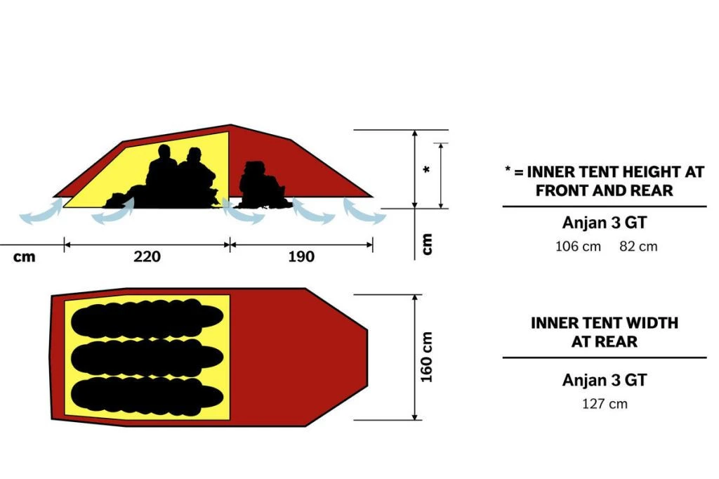 Anjan und Anjan GT sind sehr leichte Tunnelzelte für Mehrtagestouren unter schneefreien Bedingungen. Die einseitig zugänglichen Öffnungen des Gestängekanals garantieren einen schnellen, unkomplizierten Aufbau. Das Außenzelt reicht bis zum Boden, wobei die bogenförmigen Aussparungen der stetigen Belüftung dienen. Zudem tragen eine Innenzelttür aus Mesh-Material und ein dreieckig geschnittener Netzlüfter im hinteren Bereich zur Frischluftversorgung bei. Eine willkommene Option an heißen Tagen: Zur maximalen Belüftung lässt sich die Vorder- und Rückseite des Außenzelts – sowie bei den GT-Modellen die gesamte Apside – einrollen.