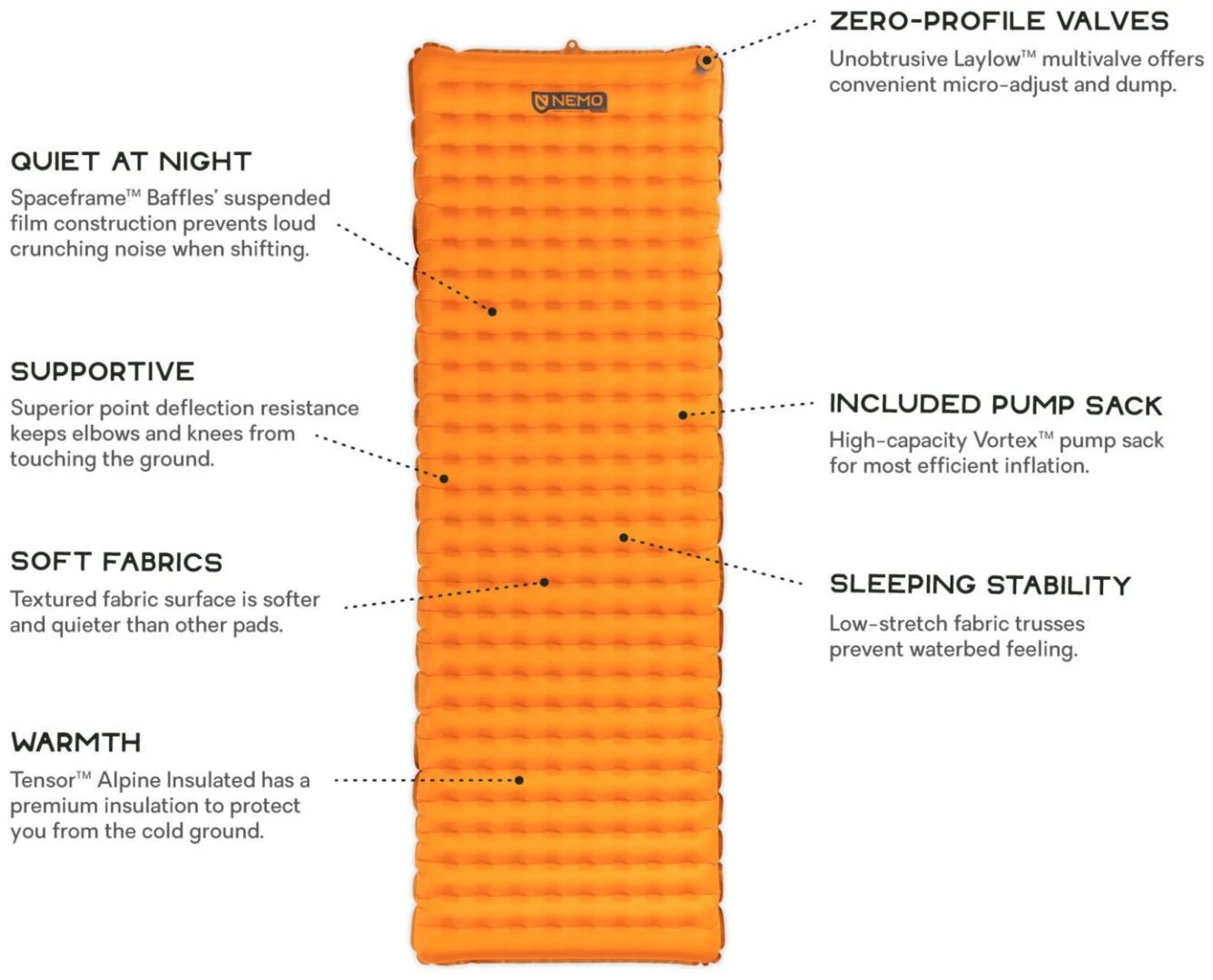 Patent-pending Spaceframe™ baffles are low-stretch trusses that provide greater stability and point deflection resistance than competitors. Tensor™ Alpine’s unique construction sleeps quieter than other pads.