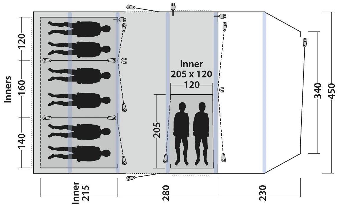 Youll love the huge amount of space for flexible campsite living in the feature-packed, king-size Queensdale 8PA inflatable tent. Sleeping up to eight in up to four bedrooms, its perfect for sharing with family and friends on long camping holidays. An inner tent in the living area offers the option to have a guest room or to use it for handy storage.