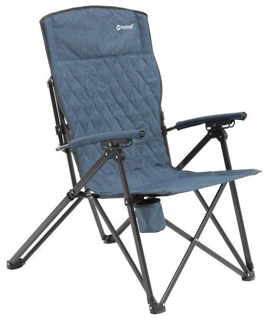 Vollpolsterung aus Polyester mit dreifach verstellbarer Rückenlehne für perfekten Komfort beim Essen oder Entspannen, getragen von einem langlebigen, hochfesten, pulverbeschichteten Stahlrahmen mit gepolsterten Armlehnen. Mit Becherhalter und Tragetasche.