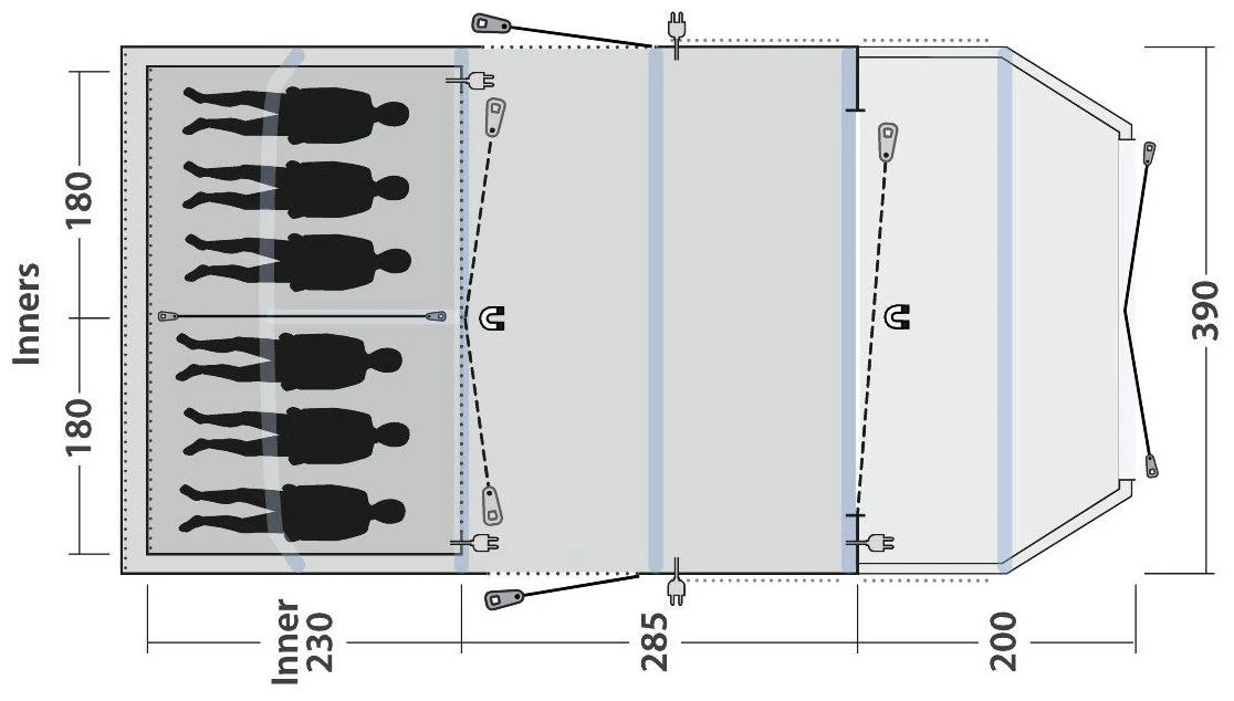 Its technical cotton fabric maintains a pleasant internal temperature, perfect for the sunshine of Southern Europe as well as on colder days. Ventilation is easily boosted on very hot days by the mesh doors in both sides of the living area. With the addition of an optional ONS Light Unit Set, the welcoming Outwell Nightlight System (patented) at the front door guides you when darkness falls and the ONS inside the tent creates a cosy atmosphere through the evening.