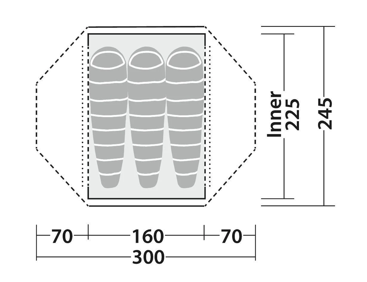 Das Kuppelzelt Lodge Pro 3 mit kurzer, querlaufender Firststange bietet dank der beiden Vorräume ein hohes Maß an Flexibilität. Die Höhe und Breite im Zelt ist ideal für drei Camper. Zudem sorgt das durchdachte, rechteckige Innenzelt mit vertikalen Türen für eine besonders effiziente Ausnutzung des Platzes. Die Außentüren lassen sich flexibel öffnen und bieten einen mühelosen, windgeschützten Zugang zum Zelt. Zur Unterstützung der niedrig angeordneten und der von innen anpassbaren oberen Lüftungsöffnungen können beide Türen geöffnet werden, sodass ein Durchzug entsteht. Die Stangenkanäle an den kurzen Enden erleichtern den Überblick über das Leichtmetall-Gestänge und beschleunigen das Aufstellen.